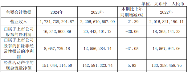 2024年,尚纬股份营业收入为17.35亿元,同比下降21.39%;归属于上市公司股东的净利润0.16亿元,同比下降20.06%;归属于上市公司股东的扣除非经常性损益的净利润0.09亿元,同比下降31.05%;经营活动产生的现金流量净额1.51亿元,同比增长5.93%。